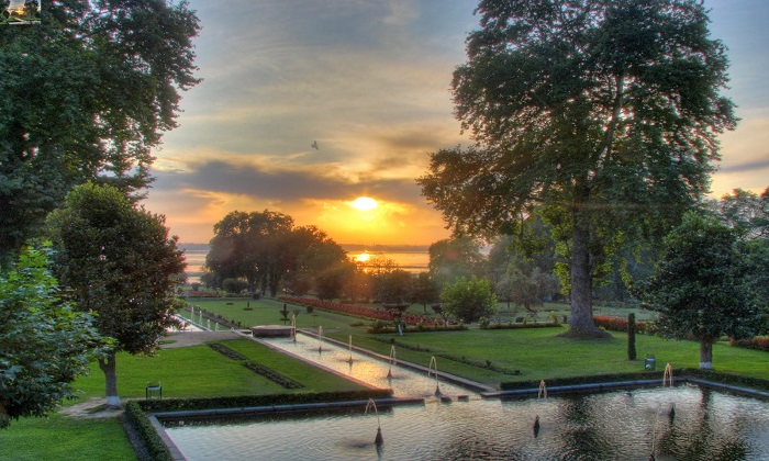 Nishat garden is the largest one of the Mughal gardens in Kashmir. It is situated on the banks of the picturesque Dal Lake. Also known as "the garden of bliss", the Nishat gardens have the Zabarwan Mountains forming its backdrop. Asaf Khan, the brother of Nur Jahan, designed the Kashmir Nishat Bagh in 1633 AD. Within the garden are ruins of some of the buildings dating back to the Mughal period. One of them is a double story pavilion enclosed on two sides with latticed windows. There is also a small spring behind the garden, known as Gopi Tirth. It is a source of supply of crystal clear water to the garden. Nishat Bagh is a Mughal garden built on the eastern side of the Dal Lake, close to the Srinagar city in the state of Jammu and Kashmir. It is the second largest Mughal garden in the Kashmir Valley. The largest in size is the Shalimar Bagh, which is also located on the bank of the Dal Lake. Nishat Bagh is a Hindustani word, which means "Garden of Joy," "Garden of Gladness" and "Garden of Delight.